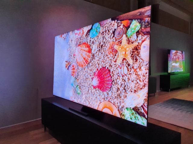 Le modèle star de Samsung pour cette année, cela reste bien sûr son Q950TS, un téléviseur au design baptisé Zero Bezel Infinity Design presque entièrement dépourvu de bordures, et longuement pressenti par les rumeurs. Dans les faits, le téléviseur de Samsung est impressionnant avec sa dalle de 65 pouces et son épaisseur ultra-réduite de seulement 15mm, d’autant plus que le dos est totalement plat, permettant de le coller au mur et ainsi renforcer l’effet immersif procuré par cette dalle borderless. On retrouve une dalle LCD largement améliorée grâce à la technologie QLED du constructeur – encore plus bluffante cette année – et une définition 8K qui pourra compter sur un tout nouveau processeur avec un meilleur upscaling. Le Samsung Q950TS est également équipé d’un système sonore équipé d’une fonction nommée OTS (pour Object Tracking Sound Plus) qui permet de reconnaître les sources sonores des vidéos et ainsi de « suivre » un mouvement visible à l’écran.