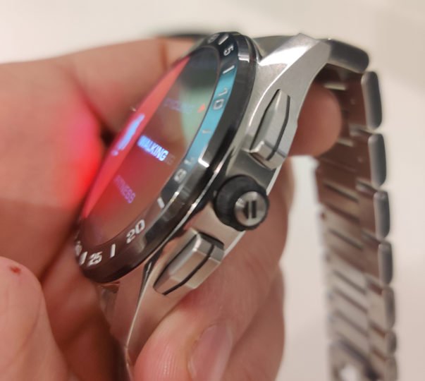 A noter que les deux boutons-poussoirs à 2h et 4h servent de raccourcis pour ouvrir l’application sport, mais également pour activer la fonction démarrage, pause et reprise de l’activité. La couronne, dotée d’une bague en caoutchouc, permet de faire défiler le résumé de l’activité.