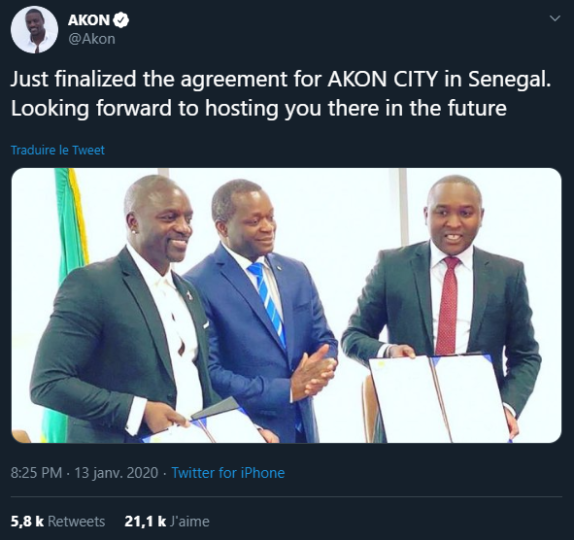 Attention les yeux, si vous trouvez que le lancement de cette cryptomonnaie est ambitieux, vous n’êtes pas au bout de vos surprises. Le projet Akoinne s’arrête pas à la création d’une cryptomonnaie et d’un écosystème financier. En effet, pour accompagner Akoin, le rappeur américain souhaite développer une ville complète. Vous avez bien lu, une ville. Elle sera située en Afrique, au Sénégal. En janvier dernier, un accord officiel avec le gouvernement sénégalais a été annoncé autorisant Akon à enclencher les créations de sa city.
