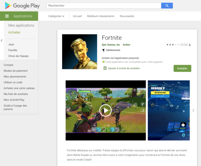 C’est pourquoi, depuis l’été 2018, les utilisateurs de smartphones sous Android doivent se rendre sur le site d’Epic pour télécharger Fortnite. Il s’agit en l’occurrence d’une application portail, l’Epic Games App, qui permet d’accéder au catalogue de jeux Android du studio. Mais ce dernier a dû se rendre à l’évidence : le Play Store représente une vitrine impossible à négliger, même pour un jeu aussi populaire que Fortnite.