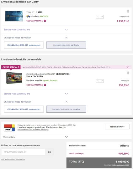 Offre intéressantes chez Darty avec une console Microsoft Xbox One X offerte pour l’achat simultané d’une TV LG 55E9 OLED ou LG 55C9 OLED (grâce à une remise immédiate de 499,99€ répartie sur l’ensemble), le tout vous reviendra donc à 1499 euros. Notez que l’offre fonctionne également avec la TV QLED SAMSUNG QE55Q80R, le tout revenant à 999 euros ! Pour bénéficier de l’offre, il faut ajouter les deux produits dans votre panier.