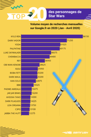 Kylo Ren et l’inusable Dark Vador sont les deux personnages de la franchise Star Wars les plus recherchés par les internautes Français en 2020, avec respectivement 96 150 et 71 250 recherches mensuelles en moyenne. Maitre Yoda complète le podium et sauve la face des chevaliers Jedi avec 61 025 recherches mensuelles en moyenne en 2020. A noter que les héros des trilogies n’ont pas vraiment les faveurs des internautes : Luke Skywalker est 5e (46 675), Rey 7e (36 950) et Obi Wan 8e (28 625). Et même Han Solo, dont certaines répliques sont cultes, n’est que 12e (22 875) !