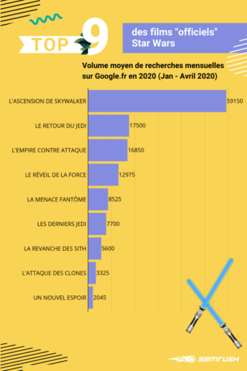 Kylo Ren est-t-il donc en passe de devenir LE méchant de la franchise ? Pas sûr puisqu’il jouit sans aucun doute de la popularité du dernier né de la saga sortie en fin d’année 2019. Avec encore 59 150 recherches mensuelles en moyenne, « L’Ascension de Skywalker » est le film Star Wars le plus recherché en 2020, loin devant « Le retour du Jedi » (17 500) et « L’empire contre-attaque » (16 850). Par contre, le tout premier film, l’épisode 4, sorti en 1977 est bon dernier avec 2 045 recherches mensuelles en moyenne : « Un nouvel espoir » ne semble pas être entré dans la mémoire collective des internautes Français.