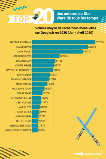Et côté acteurs, y’a-t-il une corrélation avec la popularité de leurs personnages ? De toute évidence, Adam Driver semble tirer son épingle du jeu avec 209 875 recherches mensuelles en moyenne en 2020. Son rôle dans « Marriage Story » et sa nomination aux Oscars y sont sans doute pour quelque chose. Derrière, l’actrice Daisy Ridley, plus discrète professionnellement parlant après le dernier Star Wars, semble surfer sur son personnage de Rey avec 190 250 recherches mensuelles en moyenne. A noter que Natalie Portman et sa riche carrière reste première des recherches web !