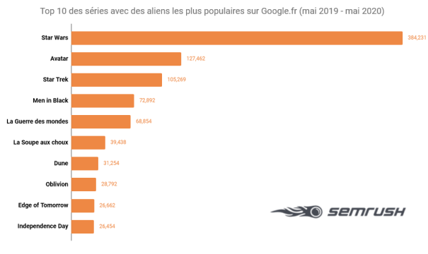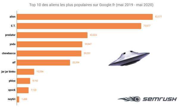 Ce 2 juillet, c’est la journée mondiale des OVNI ! À défaut d’apercevoir des objets volants non identifiés dans le ciel ce soir, vous pouvez toujours regarder les grands classiques de la pop culture qui parlent d’extraterrestres. À ce sujet, quels sont les « petits hommes verts » les plus populaires dans nos contrées ? C’est la question à laquelle a tenté de répondre SEMrush, qui a comptabilisé les recherches effectuées sur google.fr sur la période de mai 2019 à mai 2020 afin de dresser un classement des Aliens les plus populaires en France. Le septième va vous surprendre…