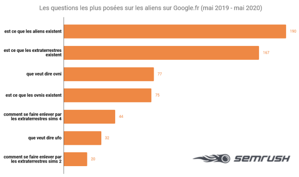 Aussi, quelles sont les questions les plus posées sur Google en France en rapport avec des extraterrestres ? Les internautes semblent avant tout se demander si les extraterrestres et les OVNI existent. Plus surprenant, de nombreux internautes veulent aussi savoir comment se faire enlever par les extraterrestres dans les SIMS 4 ou les SIMS 2.