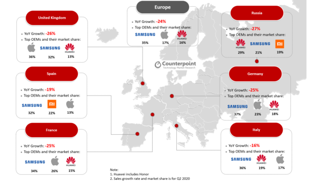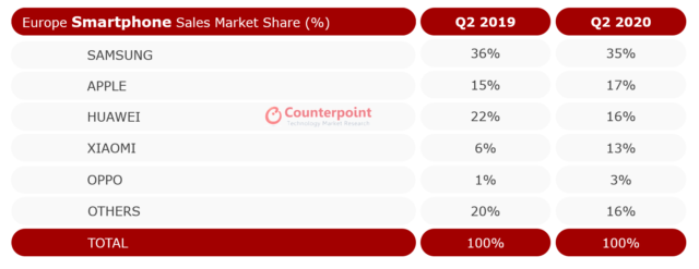 OnePlus aussi affiche un excellent bilan avec des ventes en progression de 128% en Europe de l’Ouest, grâce entre autres aux OnePlus 7t et 8. Samsung reste largement en tête du marché européen avec 35% (-1 point par rapport au deuxième trimestre 2019), suivi par Apple (17%, +2 points) et Huawei (16%, -6 points).