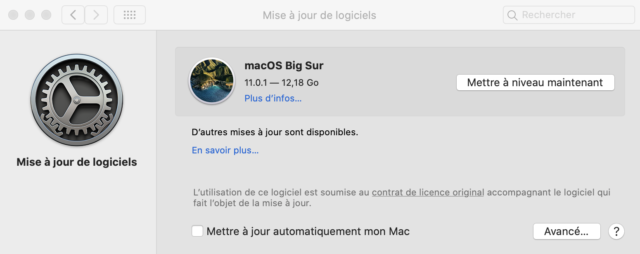 Pour installer la mise à jour, rendez-vous dans les Préférences Système, puis dans Mise à jour de logiciels. macOS big Sur devrait logiquement y apparaître et il vous suffit de cliquer sur « Mettre à niveau maintenant » pour l’installer. Si la mise à jour ne vous est pas proposé, vous pouvez toujours vous rendre à cette adresse pour ouvrir la page dédiée à macOS Big Sur dans le Mac App Store. La mise à jour pèse tout de même plus de 12 Go, il faudra donc se montrer patient.
