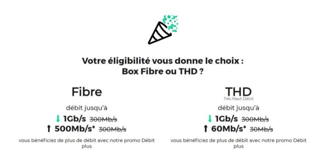 Quelques secondes plus tard, vous saurez si vous êtes éligible à la fibre et à quels débits montants et descendants vous pouvez prétendre. Très généralement, cela sera jusqu’à 1 Gb/s par seconde en débit descendant. Si vous n’êtes pas éligible à la fibre, vous devrez vous contenter de l’ADSL. Ce dernier peut déjà potentiellement dépasser votre abonnement actuel, notamment grâce à l’utilisation du VDSL permettant de monter assez haut en débit. Si la différence est importante par rapport à votre abonnement actuel, cela peut être très intéressant de changer.