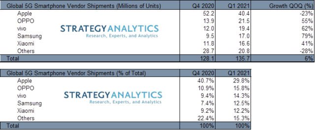 OPPO a livré 21,5 millions de smartphones 5G au premier trimestre, contre 19,4 millions pour Vivo et 17 millions pour Samsung. Le constructeur coréen a bénéficié de la plus forte croissance durant ce trimestre, grâce aux performances de ses Galaxy S21 5G, S21 Ultra 5G, et S21+ 5G. Sans oublier les modèles milieu de gamme qui, chez tous les fabricants, commencent à intégrer la 5G à des prix plus doux.