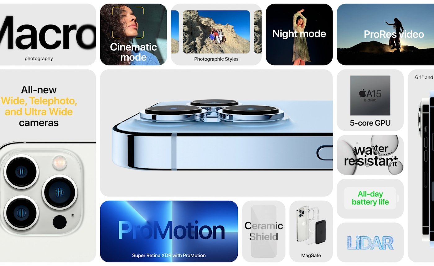 Enfin, les iPhone 13 Pro et iPhone 13 Pro intègrent une puce A15 Bionic, nouveau SoC maison d’Apple. Celui-ci est vanté comme étant 60% plus puissante que la puce concurrente la plus performante. Évidemment, cette puce est compatible avec la 5G, et elle permet même à l’iPhone 13 Pro de passer un cap en matière d’autonomie. Grâce à la puce A15 Bionic et de plus grosses batteries, l’iPhone 13 Pro propose 1,5 heure d’autonomie en plus par rapport à l’iPhone 12 Pro, et l’iPhone 13 Pro Max jusqu’à 2,5 heures d’autonomie en plus par rapport à l’iPhone 12 Pro Max.