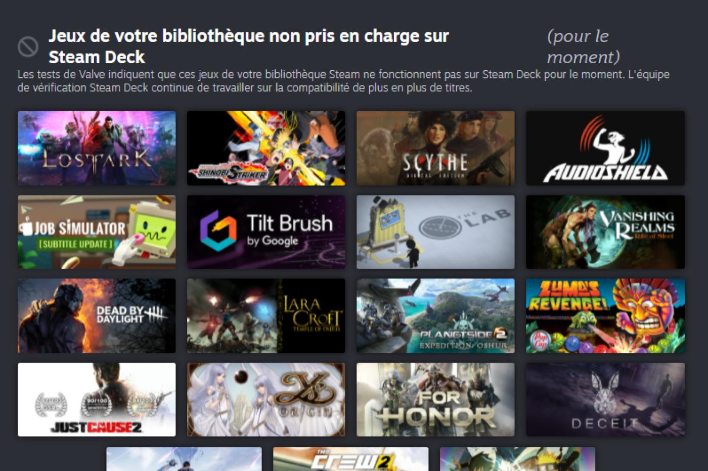 Bonne nouvelle, sur les quelques centaines de titres présents sur notre compte, la très grande majorité est estampillée compatible, tandis que quelques-uns sont seulement jouables (comprenez qu’il sera possible de les lancer, mais qu’ils nécessiteront peut-être des “étapes supplémentaires dans leur configuration ou interaction”). Aucun n’est indiqué non pris en charge hormis les jeux VR (logique), ce qui est également une nouvelle encourageante pour la suite.