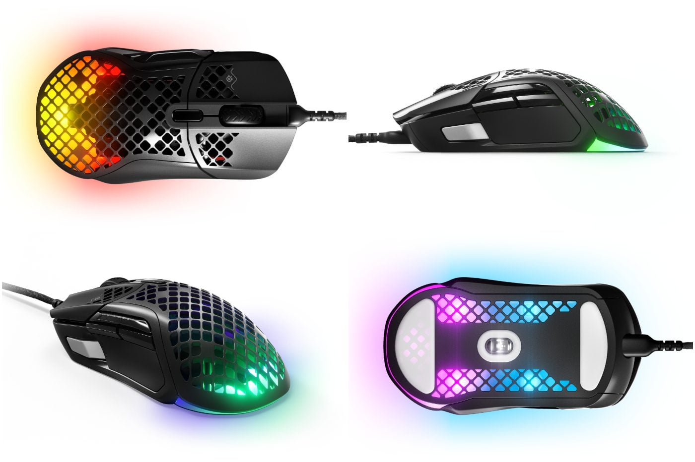 Le premier modèle, l’Aerox 5, a droit à un total de 9 commutateurs programmables, dont 5 boutons dédiés sur la face intérieure. Avec tout juste 66g sur la balance, elle est aussi très légère pour une souris polyvalente de ce type. Enfin, cette Aerox 5 est équipée du capteur propriétaire TrueMove Air, des patins PTFE Glide pour une glisse optimale, et des commutateurs maison de Steelseries, les Golden Micro.