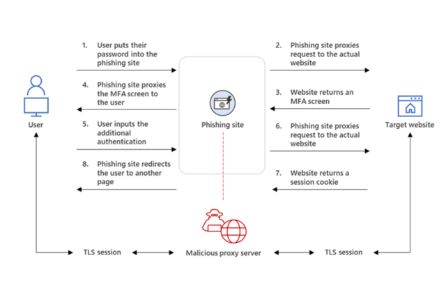 Le principe d’EvilProxy est simple : les pirates utilisent un serveur pour récupérer tout le contenu utile de l’utilisateur (identifiants, mots de passe mais aussi cookies de session). Il peut ainsi contourner la nécessité de s’authentifier avec des jetons d’authentification à double facteur.