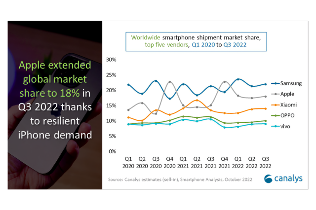Au troisième trimestre, Apple est le seul constructeur à afficher une hausse de ses livraisons. Il atteint 18 % du marché mondial, derrière Samsung (22 %) et juste devant Xiaomi (14 %). Oppo et Vivo ferment la marche avec 11 % chacun.