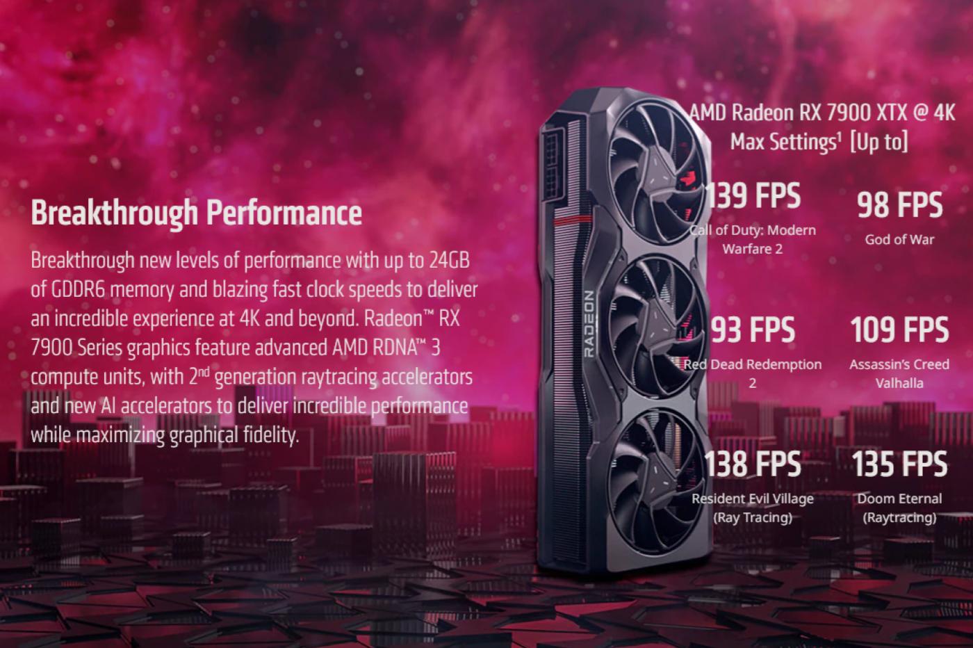 De quoi atteindre un impressionnant 62 ips en 4K sur Cyberpunk, avec ray-tracing activé. Dans cette même résolution, AMD affirme aussi que cette carte est capable de pousser les jeux compétitifs modernes jusqu’à leur limite absolue en termes d’images par seconde. La 7900 XTX peut ainsi débiter 300 images par secondes sur Apex Legends, 355 ips sur Overwatch 2, et même plus de 700 ips sur Valorant en 4K !