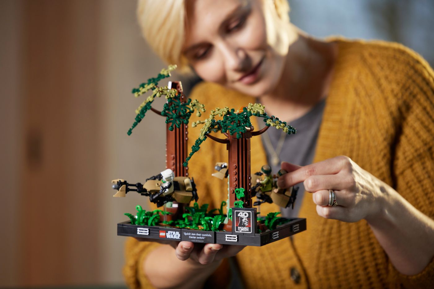 De ses 807 pièces, la salle du trône s’annonce massive en comparaison avec les autres dioramas. Celui-ci s’accompagne bien évidemment de mini-figurines Luke, Vador et Palpatine afin de recréer différents moments de cette scène cultissime. Il faudra compter 99,99€ pour cette construction, tandis que celle d’Endor bien plus modeste en apparence coûtera malgré tout 79,99€. Actuellement disponibles en précommandes, ces deux reproductions de scènes seront disponibles dès le 1er mai prochain.