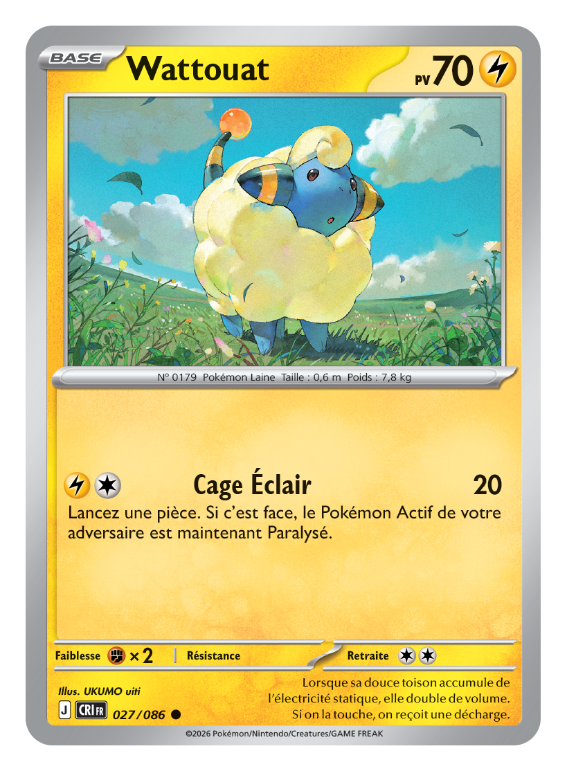 Pas question ici de se retrouver avec des cartes de remplissage sans intérêt. La lignée d’évolution commence avec la carte de base de Wattouat qui s’en tire avec 70 PV et une unique attaque, Cage Éclair, qui inflige 20 dégâts et peut paralyser le Pokémon Actif adverse sur une pile. C’est basique, mais une paralysie gratuite en début de partie peut vraiment faire la différence pour gagner un précieux tour.