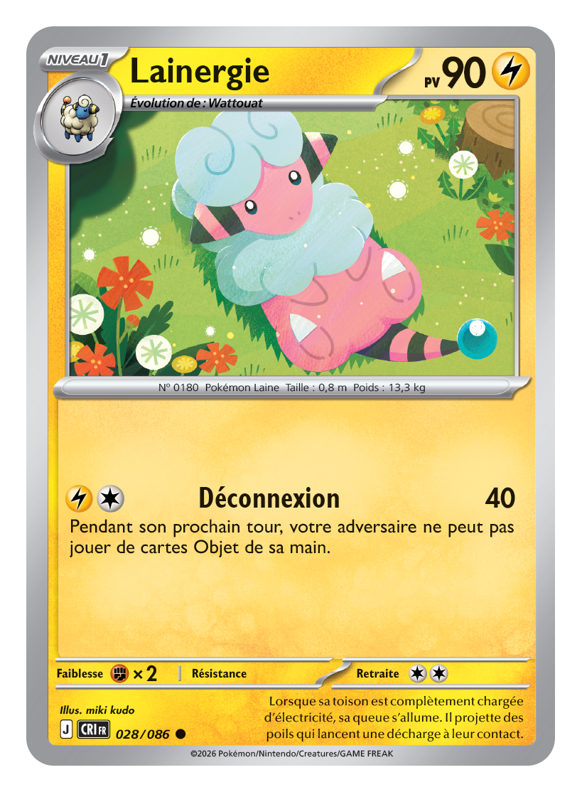 Lainergie prend la relève avec 90 PV et une attaque bien plus dérangeante pour l’adversaire. Déconnexion inflige 40 dégâts et empêche l’adversaire de jouer des cartes Objet pendant son prochain tour. Dans un méta où les Objets font tourner la quasi-totalité des decks compétitifs, couper l’accès aux Pokéballs, aux potions et autres Méga canne dès le milieu de partie peut sérieusement perturber les plans adverses.