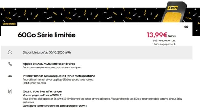 Sosh lance un nouveau forfait mobile en série limitée pour la rentrée : 60 Go pour 13,99 euros par mois, sans limite de durée et sans engagement. C’est aujourd’hui selon nous le meilleur forfait que vous trouverez sur le réseau Orange. L’offre est disponible jusqu’au 5 octobre, uniquement pour les nouveaux clients.