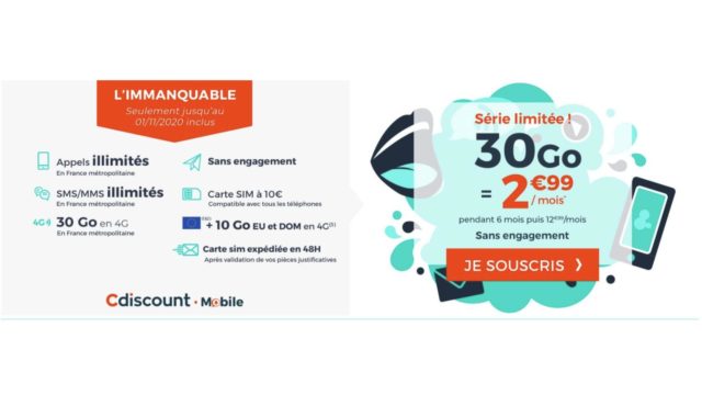 Disparu depuis plusieurs semaines, le forfait 30 Go à 2,99 euros par mois est de retour chez Cdiscount Mobile. Outre ses 30 Go de 4G, il offre également le SMS, MMS illimités en France et une enveloppe de aussi 10 Go en l’Europe. Comme souvent chez Cdiscount, ce tout petit prix ne dure que 6 mois, il passera ensuite à 12,99 euros par mois. Il s’agit en revanche d’un forfait sans engagement que vous pouvez donc résilier à tout moment. L’offre est disponible jusqu’au 1er novembre.