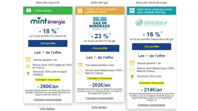 Enfin, si vous souhaitez un fournisseur unique pour le gaz est l’électricité, c’est EkWateur qui offre une ristourne de 16 % par rapport au tarif réglementé. Cette fois, la remise n’est plus indexée, mais garantie un an.