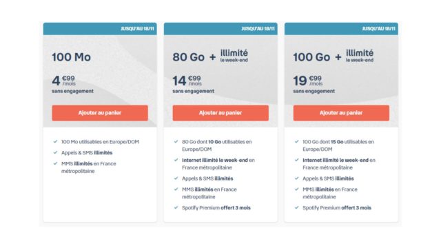 Si 80 Go de 4G avec les week-ends illimités en plus vous semble trop peu, sachez que Bouygues propose un forfait identique, mais avec 100 Go de data et 15 dans l’Union européenne. Il est alors facturé 19,99 euros par mois. C’est aussi une bonne option, mais nous trouvons que l’offre 80 Go est un meilleur rapport qualité-prix. Après tout 5 euros par mois pour 20 Go de plus, nous trouvons que c’est cher payé. À vous de voir.