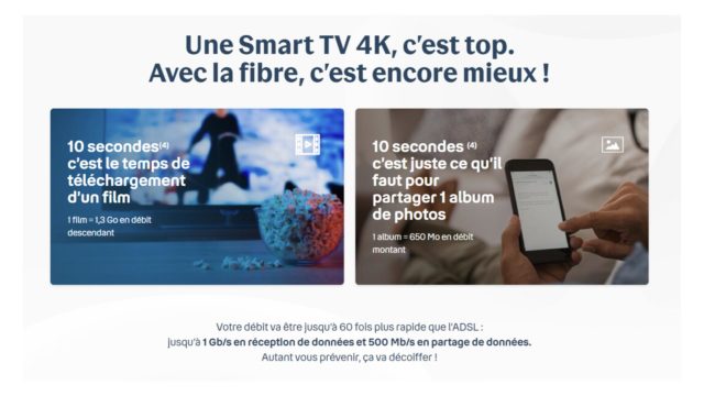 L’offre fibre incluse dans l’offre Bbox TV est très complète et embarque tous éléments importants d’un bon abonnement fibre. Cela commence par internet avec un débit descendant maximum de 1 Gb/s par seconde. C’est aujourd’hui très largement suffisant pour n’importe quel usage domestique ou même de télétravail. Vos fichiers se téléchargeront très rapidement et vous streamerez tout le contenu que vous souhaitez, y compris en 4K sur le téléviseur.