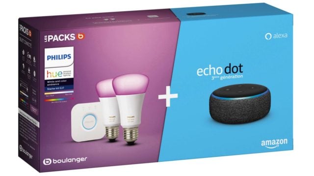 Ce coffret, expédié par Boulanger et vendu sur Rakuten (ou directement sur le site Boulanger), comporte un pack de 2 ampoules “white and color” E27, un pont de connexion Hue et l’enceinte connectée Echo Dot 3 d’Amazon. Avec cet ensemble, vous aurez accès à tout ce qu’il vous faut pour commencer à contrôler votre éclairage directement avec votre voix ou votre téléphone, y relier des objets connectés Hue et vous lancer. Vous n’aurez qu’à brancher le pont de connexion Philips à votre prise secteur pour démarrer l’installation rapide.