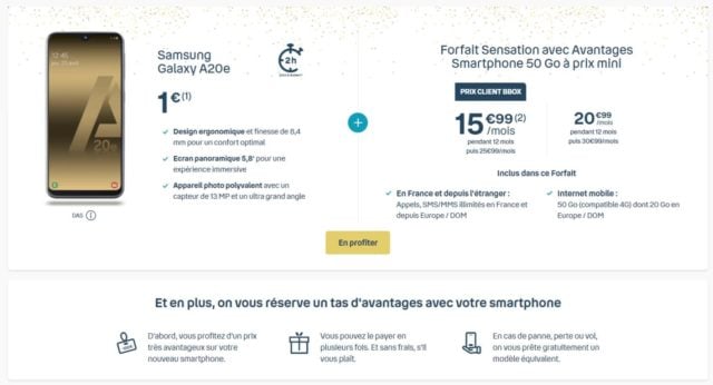 Pour bien commencer l’année, offrez-vous un Galaxy A20e à petit prix chez Bouygues Telecom. Le smartphone de Samsung est disponible à 1 euro seulement (et sans mensualités supplémentaires) grâce au forfait Sensation 50 Go. Vendu 189 euros seul, vous réalisez donc une économie de 188 euros ! Vous pourrez opter pour une livraison traditionnelle sous 48h ou profiter du Click and Collect, pour retirer votre smartphone en boutique dans les 2 heures qui suivent votre commande. Profitez-vite de cette offre avant qu’il ne soit trop tard.