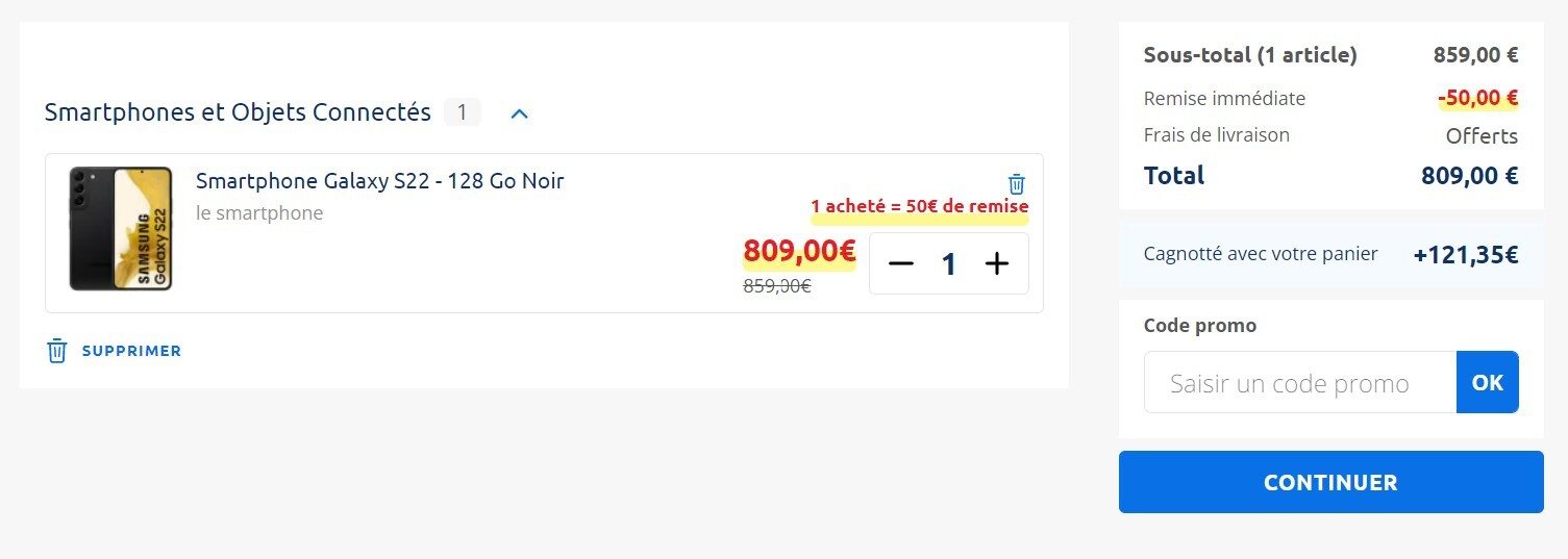 Pour profiter de ce bon plan qui permet d’avoir le Galaxy S22 à seulement 687,65 euros au lieu de 859 euros, c’est du côté de Carrefour qu’il faut se tourner. Le géant français de la grande distribution propose le smartphone de Samsung à 809 euros au lieu de 859 euros grâce à une réduction immédiate de 50 euros. Ensuite, c’est grâce à une remise de 121.35€ reversée sur la carte fidélité qu’il est possible de l’avoir à ce tarif très avantageux.
