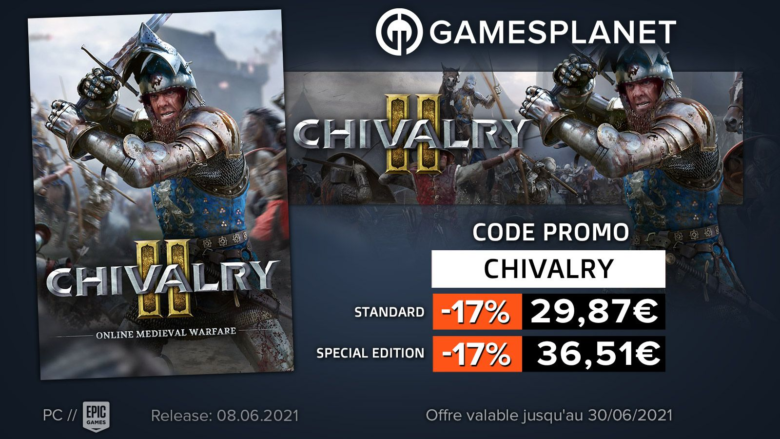 17% de réduction sur les 2 éditions avec le code promo : CHIVALRY. Notez que les précommandes bénéficient d’un accès à la béta privée du 26 au 29 Mars, ainsi qu’une arme spéciale supplémentaire