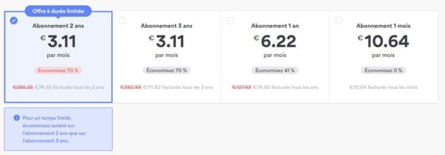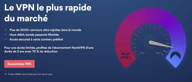 Le meilleur VPN du marché vous fait actuellement profiter d’une offre de 2 ans d’abonnement à -70% ! Avec cette remise, vous bénéficiez d’un tarif imbattable sur un VPN, et cela d’autant plus sur NordVPN qui se classe incontestablement parmi les meilleurs services disponibles. Avec cette réduction, vous profitez ainsi de deux années d’abonnement pour seulement 74,55 euros, soit 3,11/mois !