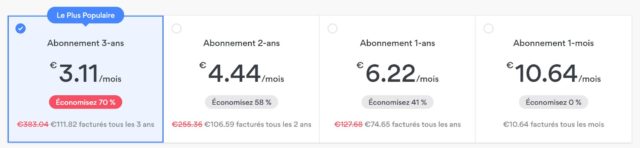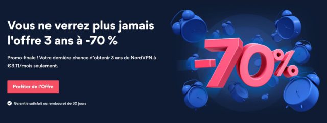 Le meilleur VPN du marché vous fait actuellement profiter d’une offre de 3 ans d’abonnement à -70% ! Avec cette remise, vous bénéficiez d’un tarif imbattable sur un VPN, et cela d’autant plus sur NordVPN qui se classe incontestablement parmi les meilleurs services disponibles. Avec cette réduction, vous profitez ainsi de trois années d’abonnement pour seulement 11.82 euros par an, soit 3,11/mois !