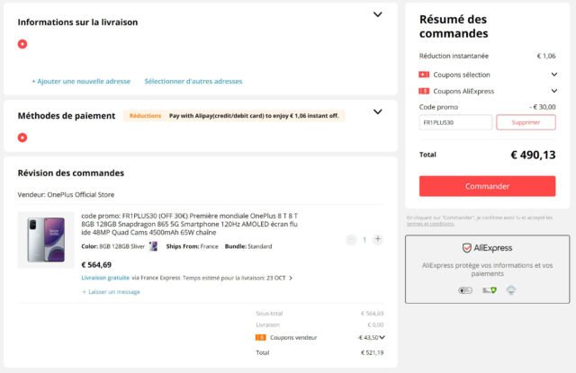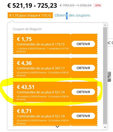 1/ Une fois logué à votre compte Aliexpress, récupérez le coupon de 43 euros sur la page produit.