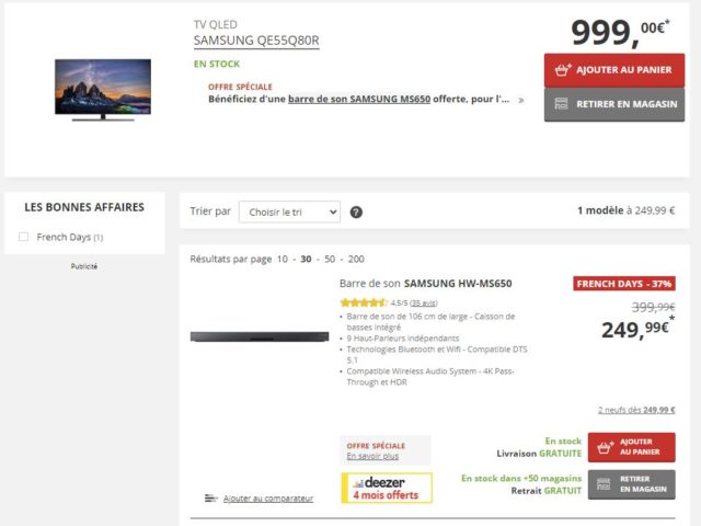 Si vous achetez une TV QLED SAMSUNG QE55Q80R 4K UHD chez Darty d’une valeur de 999 euros, vous repartirez avec une barre de son SAMSUNG HW-MS650 offerte (valeur : 249,99 euros). Mettez bien les deux produits dans votre panier pour profiter automatiquement de l’offre.