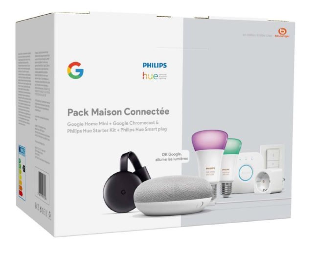 Ce pack “Maison Connectée” comprend un assistant vocal Google Home Mini, un Google Chromecast 3, une prise connectée Philips Hue, le pont de connexion Hue, une télécommande Hue Dim Switch et deux ampoules E27 Hue White and colors. Il est disponible au prix de 179 euros chez Boulanger ou 170 euros en passant pas Google avec le code BIENVENUEMAI !