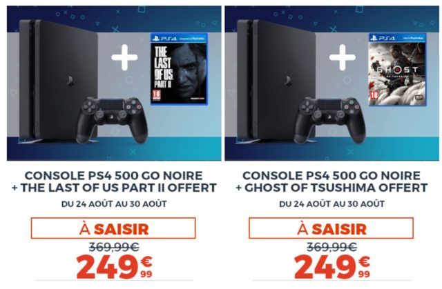 Mais on notera également d’autres promotions intéressantes comme une remise de 50 euros + The Last of Us Part II ou Ghost of Tsushima offert pour l’achat d’un Pack PlayStation 4 !