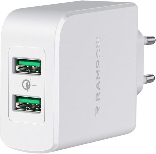 - RAMPOW Chargeur USB mural de 39W Power Quick Charge 3.0 avec 2 ports USB, compatible avec de nombreux smartphones équipés de la charge rapide QC 2.0 / 3.0 et prend aussi en charge les nommes Samsung Adaptive Fast Charging et Huawei FCP. Il permet de charger deux appareils en même temps avec une sortie maximale de 19.5W par port. Il dispose d’un contrôleur contre les courts-circuits, surtensions de sortie, surintensités, accumulation excessive de chaleur. Son prix est de 11,99 euros avec le code JZ77TBA6 (-40%) !