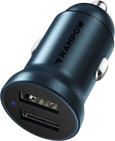 RAMPOW Chargeur Allume Cigare USB en aluminium équipé d’un double Port USB 4.8A/24W pour iPhone 11/X/8/7/6, Samsung S10/S9, iPad Air/Mini, Huawei et Plus. Il offre une charge rapide, sûre et efficace jusqu’à 2,4 A par port pour les appareils alimentés par USB. Il est compatible avec les véhicules à courant continu 12-32 V. Disponible au prix de 7,79 euros avec le code U7Y2DEDL (-40%).
