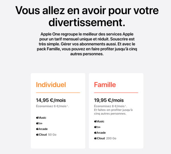 Pour l’heure, Apple One se décline seulement en deux formules : un abonnement Individuel, facturé à 14,95 euros par mois, et un abonnement Famille, facturé à 19,95 euros par mois (avec possibilité de partager l’abonnement entre six utilisateurs au total). L’abonnement à Apple One est sans engagement.