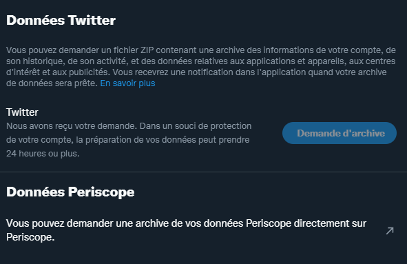 Une fois l’archive prête, quelques minutes ou quelques heures après selon votre ancienneté et le nombre de tweets et photos, un e-mail vous sera envoyé. Vous pourrez donc la télécharger directement sur votre smartphone ou ordinateur.