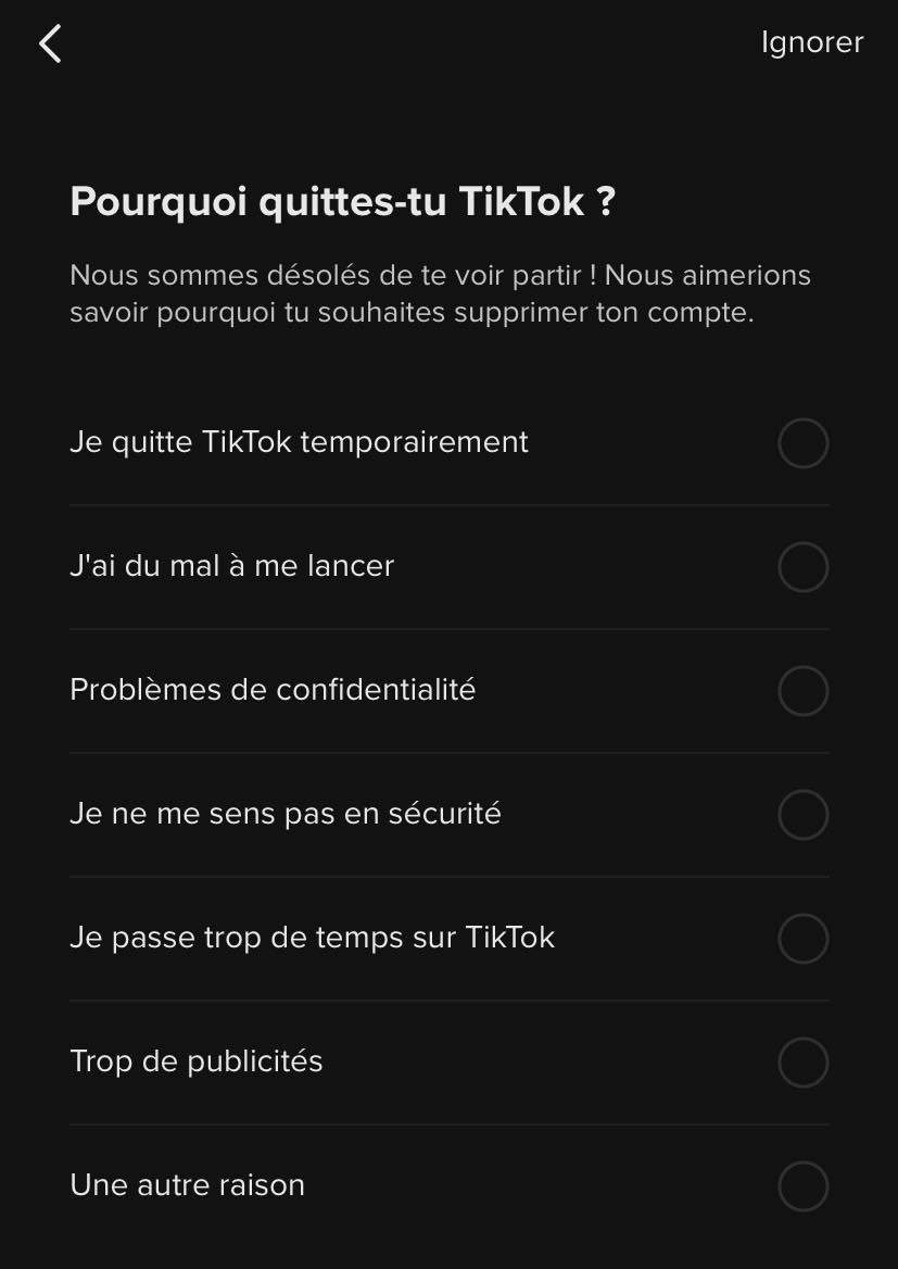 - L’application vous demandera pourquoi vous décidez de quitter Tiktok et vous proposera des alternatives et des conseils pour vous convaincre de rester. Si votre décision est prise, répondez à la question ou ignorez-la avec le bouton dans le coin supérieur droit de votre écran.