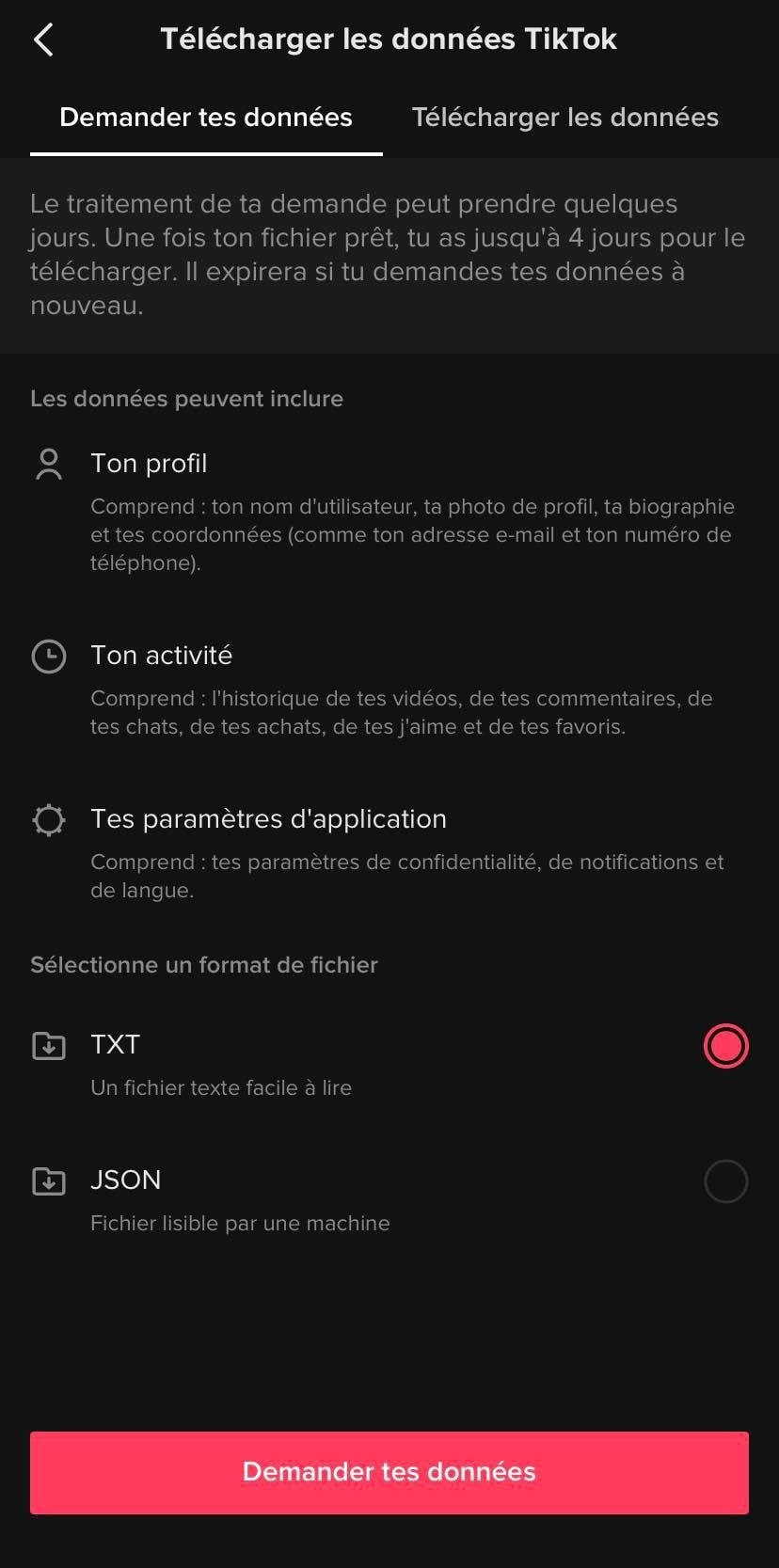 Le fichier généré contiendra les informations de votre profil, les informations de vos vidéos et les commentaires laissés, ainsi que vos paramètres détaillés. Cependant attention, ces données ne comprennent pas vos vidéos en elles même.