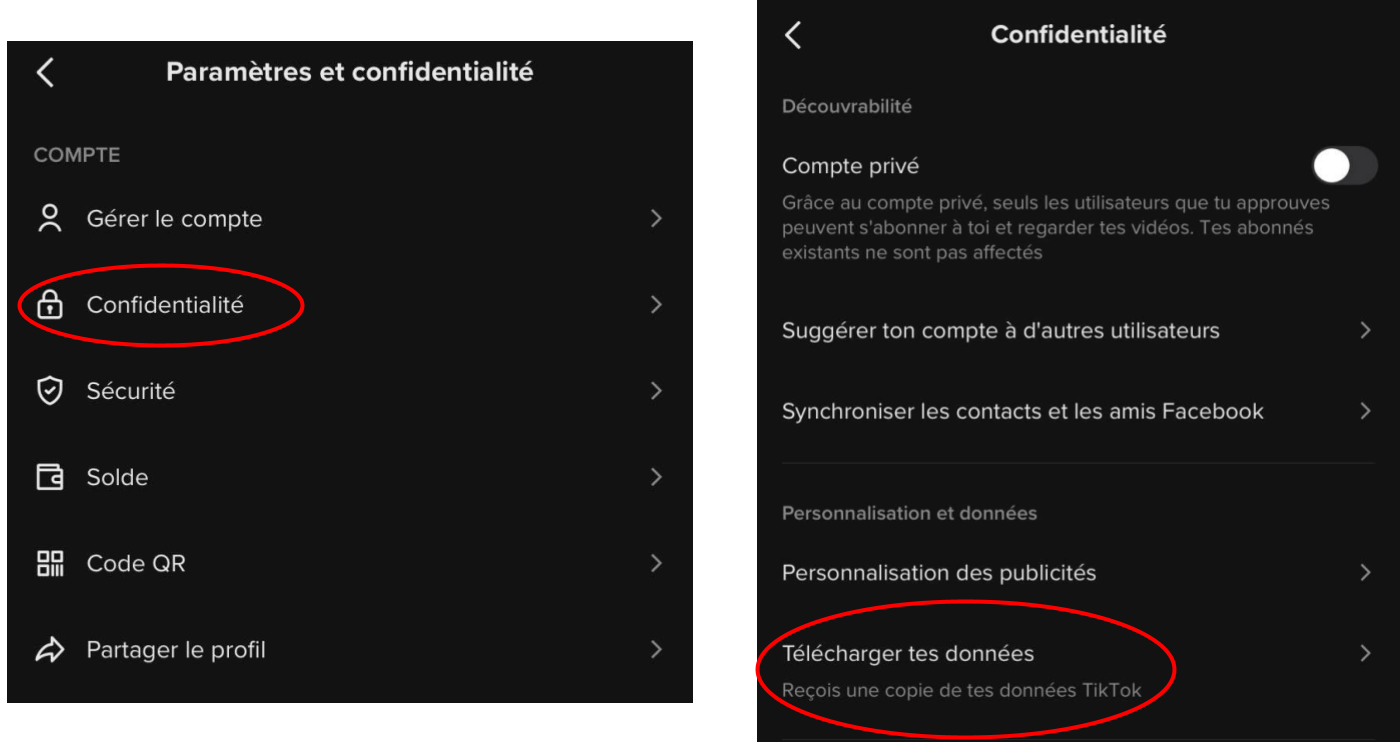 - Ouvrez le menu “Confidentialité” puis sélectionnez “Télécharger tes données”.