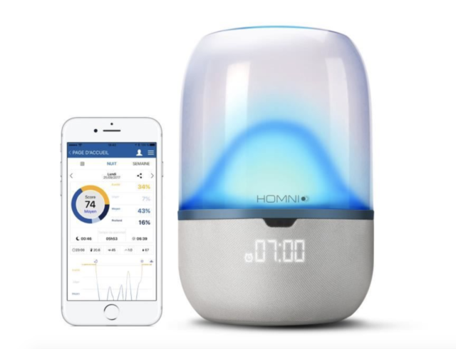 Homni est une lampe d’aide au sommeil intelligente qui aide à s’endormir et à se réveiller naturellement. Pour cela, elle intègre des programmes à base de sons et de lumières apaisants et adaptés. Grâce à l’application dédiée Wellness Coach Sleep, les données du sommeil sont recueillies dans un tableau de bord complet. Ce tableau intègre les données de l’environnement de la chambre, qui sont enregistrées par la lampe Homni (la température, l’humidité, le niveau sonore et la luminosité), ainsi que l’analyse du sommeil, effectuée grâce au capteur Dot (temps, cycles et score sommeil, ainsi que les mouvements corporels), afin de comprendre comment agir sur l’environnement de sommeil et améliorer la qualité des nuits.