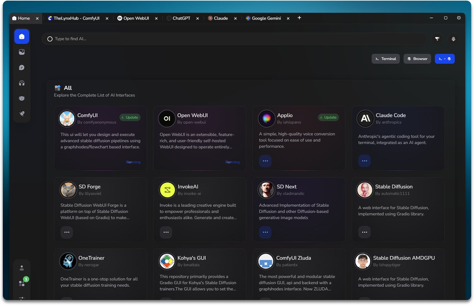 Le terminal intégré permet de surveiller les ressources système, de lancer des scripts ou de copier rapidement du texte pour l’envoyer vers un modèle IA. Le navigateur embarqué offre un rendu optimisé pour les WebUI lourdes et supporte la personnalisation des onglets. LynxHub gère également les mises à jour des modules de manière centralisée, ce qui réduit les erreurs courantes lors de la gestion de plusieurs outils simultanément.