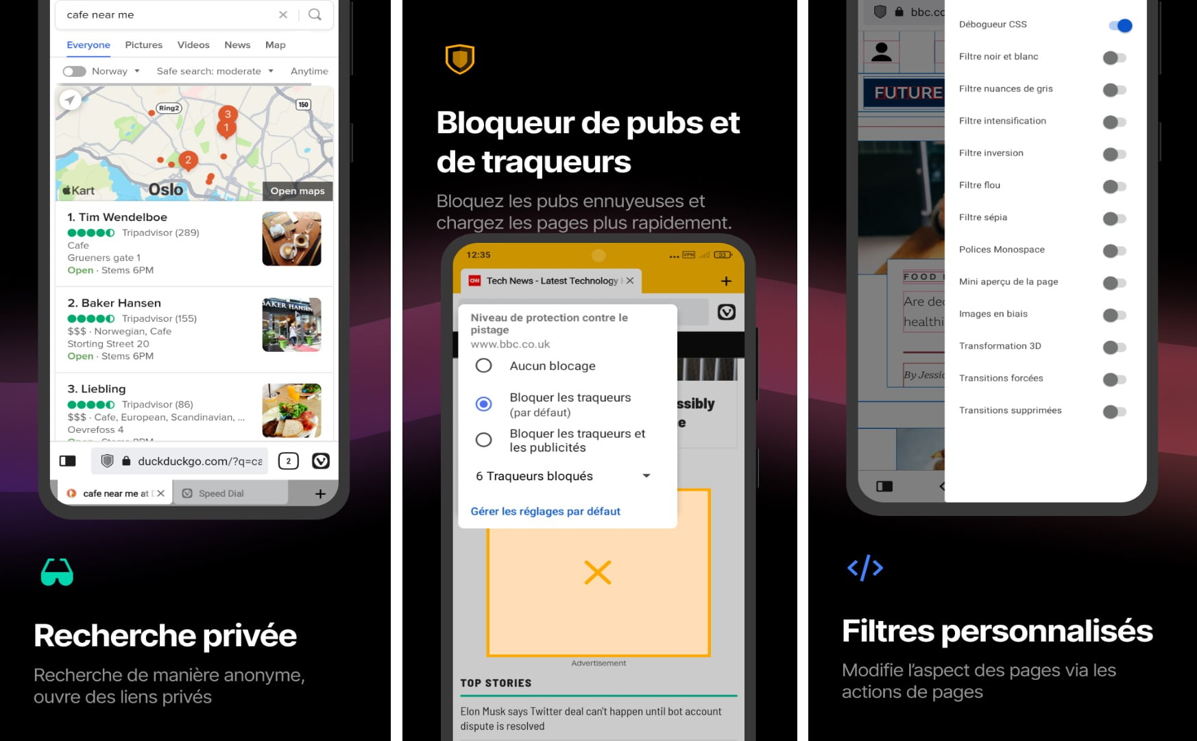 L’apparence change selon vos envies. Mode sombre complet, couleurs qui s’adaptent au site visité, thèmes personnalisés… Les utilisateurs peuvent aussi forcer le mode sombre sur n’importe quel site, même ceux qui ne le proposent pas.