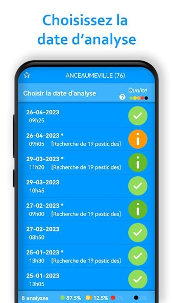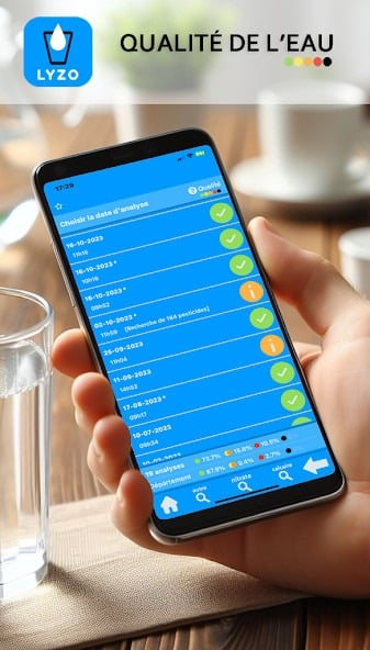 Le fonctionnement de LYZO qualité de l'eau est simple. L’application s’appuie sur les données publiques issues des contrôles sanitaires de l’eau distribuée dans les communes françaises. Elle récupère ces informations officielles, puis les présente dans une interface claire. Vous pouvez ensuite consulter rapidement la qualité de l’eau de votre commune ainsi que l’historique des analyses des derniers mois. Les données sont mises à jour régulièrement, avec parfois des résultats publiés seulement quelques jours auparavant.