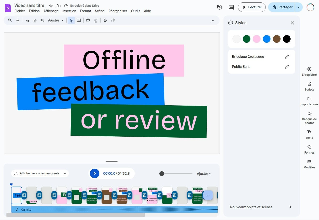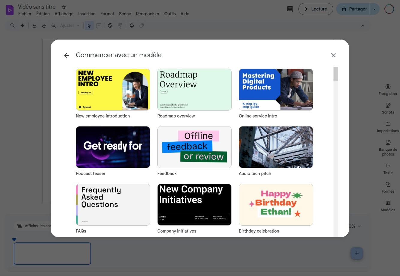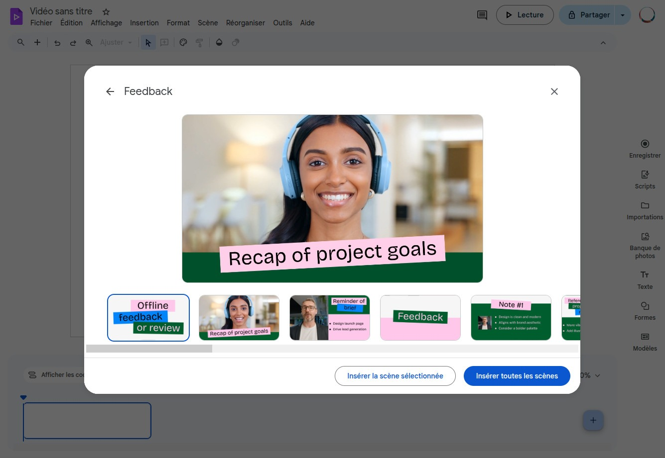 Vous pouvez également importer directement une présentation existante si vous ne souhaitez pas rédiger de prompt. Chaque diapositive devient automatiquement une scène vidéo, et vos notes de présentateur sont transformées en script pour la voix off. À l’inverse, vous pouvez partir de zéro, avec une timeline vide proposée par Google Vids.